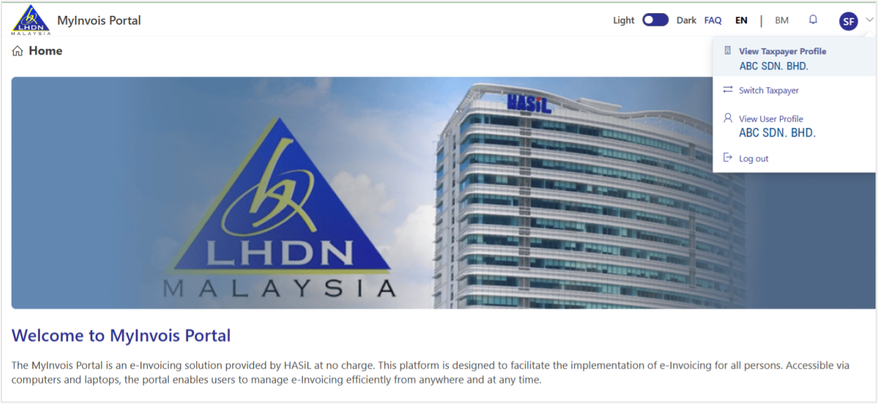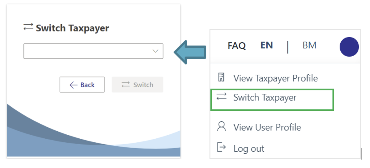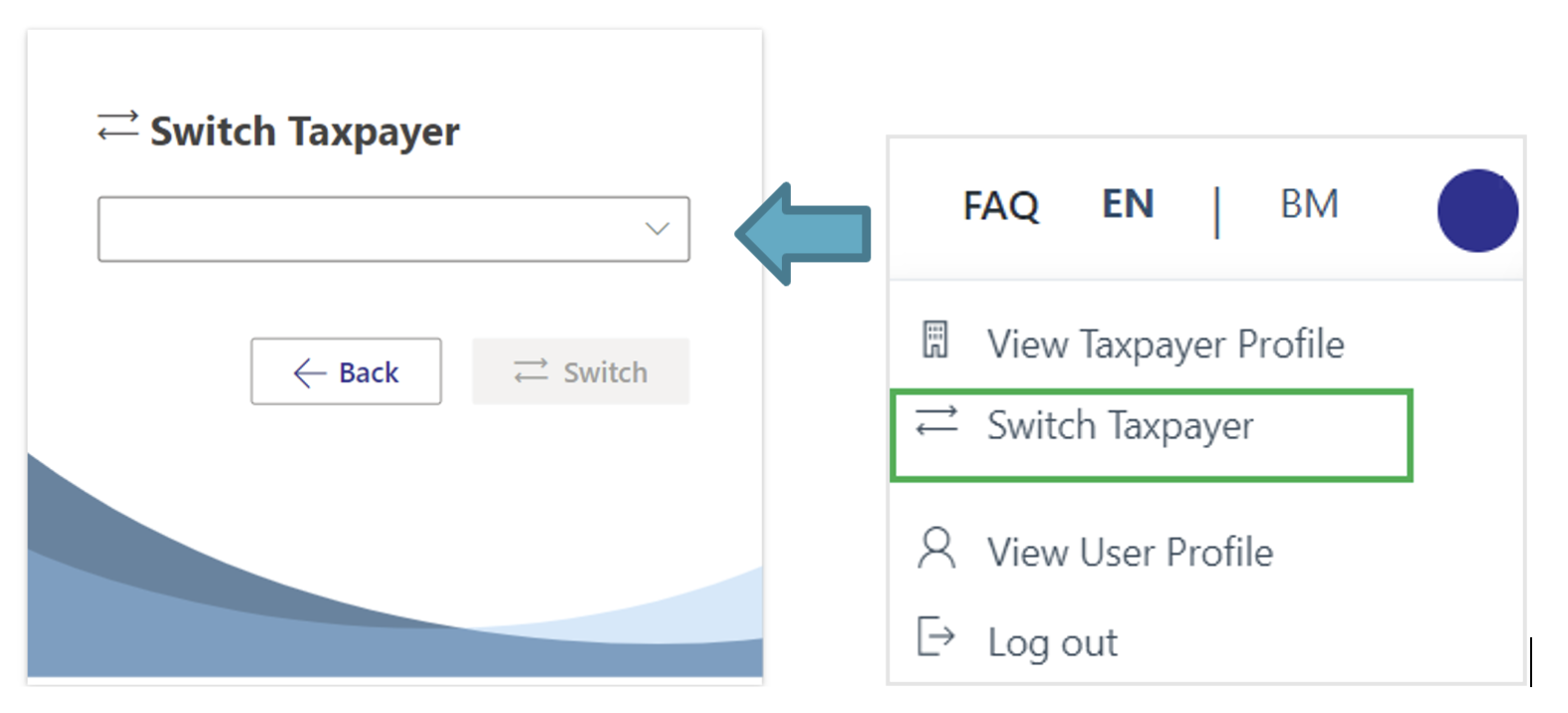 6. Under MyInvois, click Switch Taxpayer, select the company name, and click Switch (first-time setup).